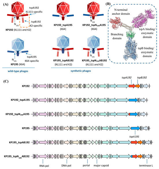 Bacteriophages KP192 and KP195 and the derived synthetic phages. (A) Schematic representation of the wild-type and synthetic phages. The capsular specificity of the synthetic phages is indicated in parentheses. “N192” and “N195” denote the N-terminal adapter domains of the tspA192 and tspA195 proteins, respectively. (B) A model of the homotrimeric type A tailspike with an attached homotrimer of type B tailspike (shown in light blue). The NTD of tailspike A is shown in red, the enzymatic domain is in magenta. The branching domain of spike A is shown in green. Parts of the model were predicted with high confidence using AlphaFold3 (https://alphafoldserver.com (accessed on 10 September 2025)). The final model was built and visualized using UCSF Chimera v.1.13.1. (C) Genomic maps of the bacteriophages. “RNA pol”—RNA polymerase gene; “DNA pol”—DNA polymerase gene; “terminase L”—terminase large subunit gene; “tspA” and “tspB”—genes of tailspike proteins A and B. The image was prepared using the clinker tool hosted at CAGECAT server (https://cagecat.bioinformatics.nl/tools/clinker (accessed on 10 September 2025)).