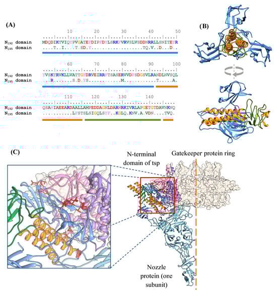 The sequences of the N-terminal domains (the first 149 amino acid residues) of the tspA192 and tspA195 proteins differ significantly (68% identity), although the AlphaFold3-generated models have a similar fold, which is typical for other T7gp17-like NTDs (PDB ID: 7BOZ, 8DSP, 7EY9, and 7Y1C) (Figure 2A,B). Some of the amino acid substitutions are located at the interface formed by the NTD of the type A tailspike and the nozzle and gatekeeper proteins that form the phage tail (Figure 2C). Structural analysis of the tail model, performed using UCSF Chimera, revealed that none of these differences result in pronounced steric hindrances or clashes between amino acid residues. However, there is a possibility that differences in these regions can reduce the efficiency of incorporation of type A spikes of the KP192 phage into the tail of the KP195 phage and vice versa, thereby reducing the replication efficiency.