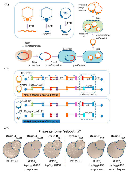 The wild-type Klebsiella phages KP192 and KP195 (GenBank accession numbers NC_047968 and NC_047970, respectively) were obtained from the Collection of Extremophilic Microorganisms and Type Cultures (CEMTC) at the Institute of Chemical Biology and Fundamental Medicine, Siberian Branch of the Russian Academy of Sciences (ICBFM SB RAS), Novosibirsk. Two synthetic phages, KP195_tspAB192 and KP192_tspA195, were used from a previous study [14]. Saccharomyces cerevisiae strain BY4741 (ATCC 4040002) was employed for transformation-associated recombination (TAR) cloning. Escherichia coli TOP10 (Thermo Fisher Scientific, Waltham, MA, USA) was used for the “rebooting” of phage genomes. The following Klebsiella pneumoniae strains were used for phage amplification and characterization: KL111-type strain CEMTC-2274 (designated AKL111); K2-type strains CEMTC-2291 (BK2), CEMTC-2573 (CK2), CEMTC-3533 (DK2), CEMTC-11061, CEMTC-11062, CEMTC-11063, CEMTC-11064, and CEMTC-11066; and K64-type strains CEMTC-2337 (EK64), CEMTC-11034, CEMTC-11036, CEMTC-11037, CEMTC-11038, CEMTC-11039 (HK64), and CEMTC-11041. The K-locus types of these strains were previously determined either by wzi gene sequencing (GenBank accession numbers: MN371474, MN371475, MN371483, MN371512, and MN371476) or by wzy allele-specific PCR [14,36].