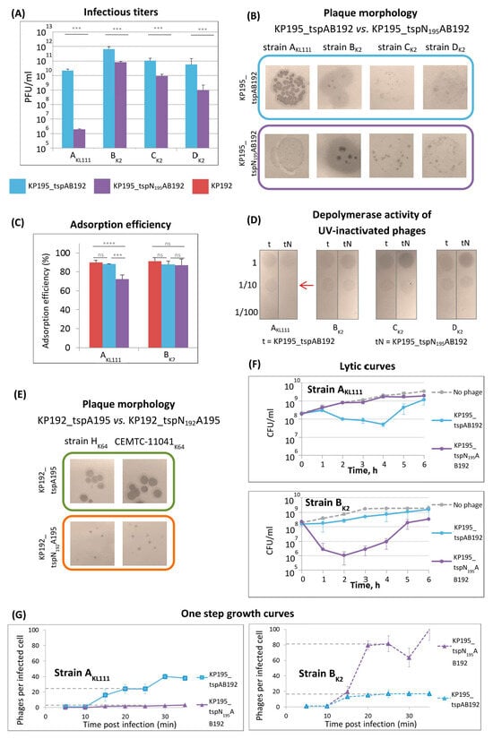 To investigate this effect, synthetic phages similar to the previously described KP192_tspA195 and KP195_tspAB192 [14], but featuring chimeric type A tailspikes, were constructed. The N-terminal domain (the first 149 amino acid residues) in such chimeric spikes corresponded to the tail of the recipient phage, and the receptor-binding domains were transferred from the RBP of the donor phage and provided the required capsular specificity (Figure 1A,C, Table 1). Following the previously established naming scheme, these phages were designated KP195_tspN195AB192 and KP192_tspN192A195, where the first part indicates the genomic scaffold, followed by an underscore and the name of the transplanted gene(s). It is worth noting that phages KP195_tspN195AB192 and KP192_tspN192A195 differed from the corresponding phages KP195_tspAB192 and KP192_tspA195 only in the region encoding the first 149 amino acid residues of the tailspike A proteins, and were otherwise identical. Therefore, a comparison of the properties of these phages allowed us to determine the effect of differences in the N-terminal domain of the type A tailspikes on phage properties.