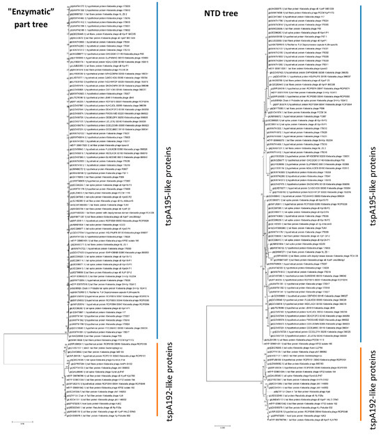 To determine whether there is a correlation between the sequence of the enzymatic part of type A tailspikes and the sequence of the NTD of these proteins, a bioinformatics search for tailspike proteins similar to tspA192 and tspA195 was performed using the NCBI Protein BLAST (https://blast.ncbi.nlm.nih.gov/Blast.cgi (accessed on 10 July 2025)) against the non-redundant protein sequences (nr) database. Sequences with >75% identity and >80% query coverage were selected. All 18 proteins closely related to tspA192 had a highly conserved NTD sequence similar to that of the N192 domain (Table 2). All 84 proteins closely related to tspA195 also had a conserved NTD sequence similar to that of the N195 domain (Table 2). Meanwhile, the mean distance between the N192-like group and the N195-like group was 0.403, indicating that these two groups differed substantially. In addition, a phylogenetic analysis of the N-terminal part of the studied sequences formed the same groups as an analysis of their enzymatic part (Figure 5). Thus, a clear correlation was demonstrated between the sequences of the enzymatic part of type A tailspikes and the sequences of their NTD in natural phages. No genes were found that encode a hybrid tsp protein containing an NTD from one group and enzymatic/receptor-binding domains from another group. This apparently reflects the fact that such hybrid tsp proteins reduced the efficiency of phage reproduction and were eliminated during evolution.