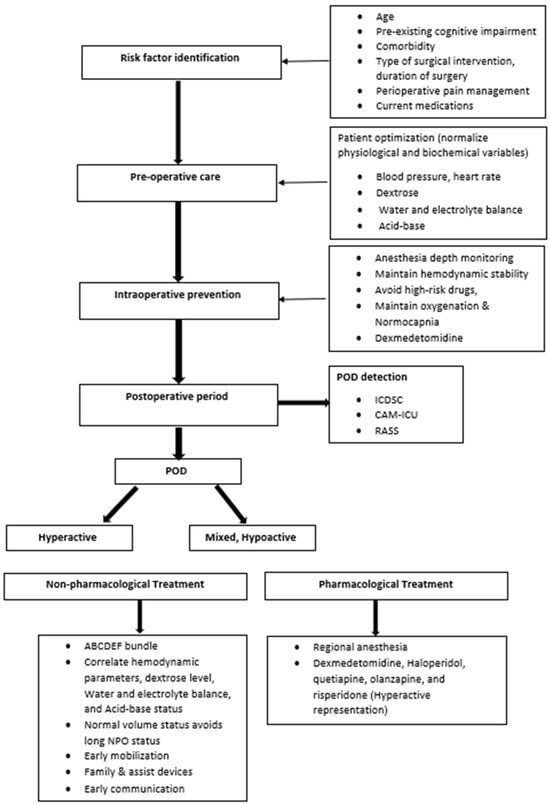 The management of POD involves a multimodal strategy that focuses on identifying and treating underlying causes, minimizing contributing factors, and using pharmacological interventions only when necessary. Non-pharmacologic measures are the foundation of care. Orientation is maintained through the use of clocks, calendars, and regular staff reorientation. ABCDEF bundle application is used to optimize sensory input by ensuring patients have their glasses/hearing aids early after surgery. Sleep hygiene is promoted by minimizing nighttime disruptions, avoiding sedatives like benzodiazepines, and encouraging early mobilization and physical therapy. Additionally, family involvement is allowed when possible (Figure 3).