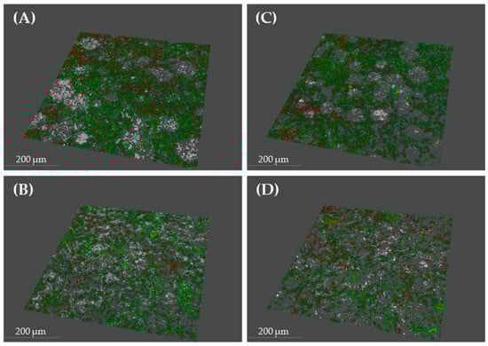 Confocal laser scanning microscopy (CLSM) images: (A) negative control biofilms incubated with phosphate-buffered saline (PBS); (B) negative control biofilms incubated with 0.25% dimethyl sulfoxide (DMSO); (C) biofilms treated with 50 µM xanthohumol (XN); and (D) biofilms treated with 500 µM curcumin (Cur). LIVE/DEAD® BacLight Kit was used to stain live bacteria (green), dead bacteria (red), and disc surfaces (white). (scale bar = 200 µm).