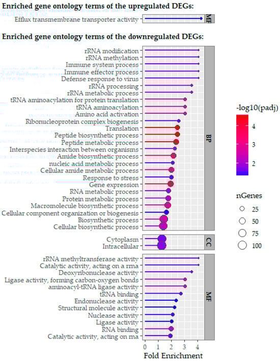 To gain insights into the biological functions linked to the differentially expressed genes, Gene Ontology (GO) enrichment analysis was conducted using the web-based tool ShinyGO (version 0.81) [http://bioinformatics.sdstate.edu/go/ (accessed on January 2025)]. This analysis categorized regulated genes into three GO groups: Biological Process (BP), Cellular Component (CC), and Molecular Function (MF), identifying significantly overrepresented functional terms (p < 0.05).
