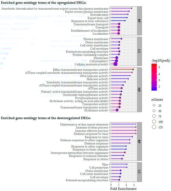 Functional categorization of significantly upregulated and downregulated genes of P. gingivalis in response to xanthohumol exposure, grouped by Gene Ontology (GO) categories: Biological Process (BP), Cellular Component (CC), and Molecular Function (MF). Enriched GO terms (p-value < 0.05) were identified using the hypergeometric test in ShinyGO after differential expression analysis with DESeq2.