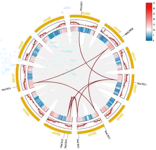 Chromosomal localization and collinearity analysis of banana CRF family genes in M. acuminata DH Pahang. Eight MaCRF genes were mapped on five chromosomes of M. acuminata DH Pahang genome. Gene duplication events were identified using the MCScanX program in TBtools software and are illustrated by red connecting lines between duplicated gene pairs. Gray lines represent all the collinear blocks within the genomes. The inner circle represents gene density, while the outer yellow ring denotes chromosomes.