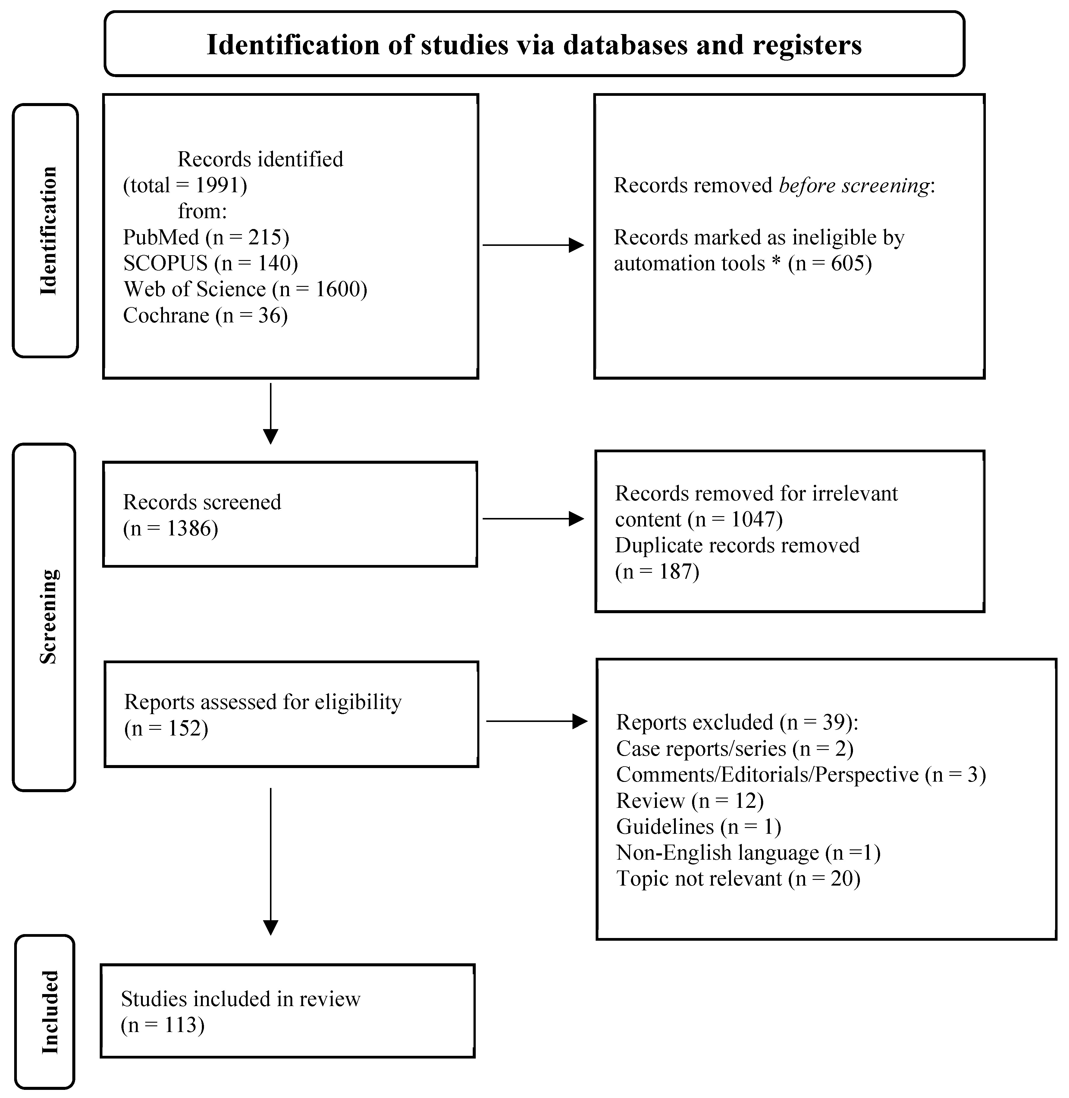 A total of 1991 records from four databases—PubMed, Scopus, Web of Science and Cochrane Library—has been identified with the aforementioned search strategy, and 605 were excluded before screening by automation tools. The three authors (G.A., G.G. and D.D.C.) independently screened, by title and abstract, 1386 records: 1047 for irrelevant content and 187 duplicates were excluded. Of the remaining 152 reports assessed for eligibility, we excluded 2 case reports/series, 3 comments/perspectives, 12 reviews or meta-analysis, 1 guideline, 1 non-English article and 20 for irrelevant topic after a more in-depth reading. The selection process is illustrated in Figure 1 and resulted in a thorough analysis of 113 records published between 2015 and January 2025, of which 48 examined the preclinical landscape of FBXW7 in CRC and 65 focused on its clinical role.