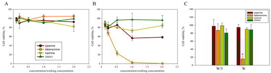 The cytotoxicity of alkaloids on human cells. M-HeLa cell viability was assessed after 2 h (A) and 24 h (B) incubation with alkaloids at concentrations ranging from twice the working concentration (400 μM piperine, 400 μM lupinine, and 40 μM tabersonine) to a tenfold dilution. (C) DF-2 cell viability was assessed after 24 h incubation with alkaloids at the working concentration (W) and at a fivefold dilution (W/5). Cell viability was estimated as a percentage, taking the cell viability in the control samples as 100%. Experimental results represent the average of analyses performed in three replicates and independently repeated three times. Values were expressed as mean S.D. (error bars). A difference to the control was considered significant at the * p < 0.05 level.