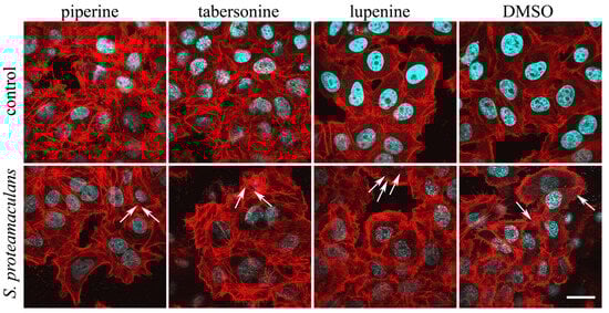 Effect of alkaloids on actin distribution in M-HeLa cells. Cells were incubated with S. proteamaculans bacteria for 2 h in the presence of 400 μM piperine, 40 μM tabersonine, 400 μM lupinine, and 0.1% DMSO. Control: cells were not infected with bacteria. The arrows indicate intracellular bacteria. The cytoskeleton was stained with rhodamine-phalloidin (red); bacterial and cellular DNA was stained with DAPI (blue). Scale bar: 20 µm.