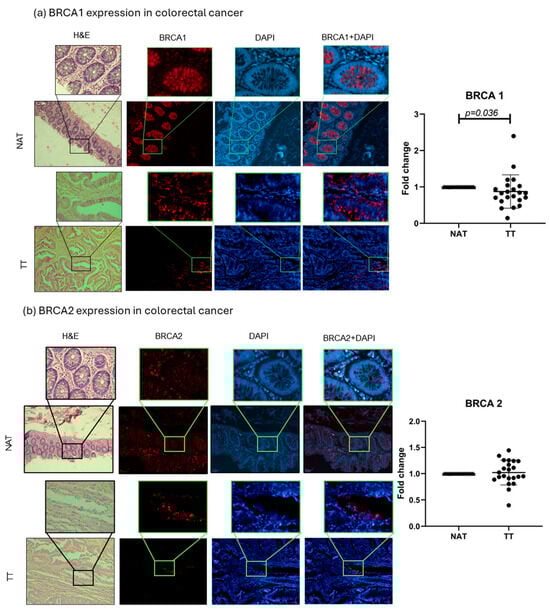 - Du, C.; Peng, Y.; He, Y.; Chen, G.; Chen, H. Low levels of BRCA1 protein expression predict a worse prognosis in stage I–II colon cancer. Int. J. Biol. Markers 2021, 36, 47–53. [Google Scholar] [CrossRef] [PubMed]