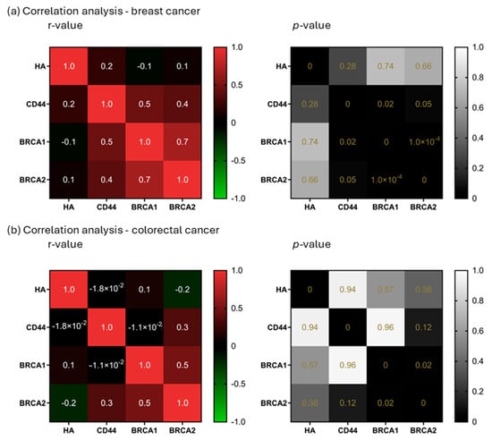 Correlation analysis. Correlation analysis of HA, CD44, BRCA1, and BRCA2 in breast (a) and colorectal cancer (b). r-values ≥ 0.7 (or −0.7 for negative relationships) were considered a strong correlation (left). p-values lower than 0.05 were considered significant (right).