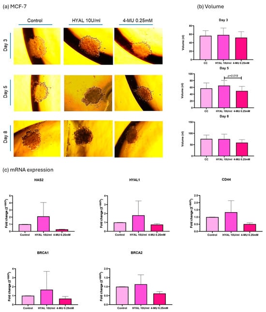 MCF-7 cell line analysis. Representative images of spheroid volume measured at 3, 5, and 8 days (a) and statistical analysis (b) are shown for control (CC), hyaluronidase (HYAL), and 4-metilumbeliferone (4-MU) treatment. mRNA expression of HAS2, CD44, HYAL1, and BRCA1 and 2 (c). p-values lower than 0.05 were considered significant. Only p-values indicating statistical significance are shown.