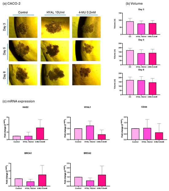 CACO-2 cell line analysis. Representative images of spheroid volume measured at 3, 5, and 8 days (a) and statistical analysis (b) are shown for control (CC), hyaluronidase (HYAL), and 4-metilumbeliferone (4-MU) treatment. mRNA expression of HAS2, CD44, HYAL1, and BRCA1 and 2 (c). p-values lower than 0.05 were considered significant. Only p-values indicating statistical significance are shown.