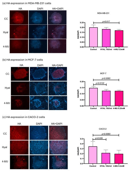 HA expression in MDA-MB-231, MCF-7, and CACO-2 cell lines. Representative images of spheroid HA expression in MDA-MB-231 (a), MCF-7 (b), and CACO-2 (c) and statistical analysis) for control, hyaluronidase (HYAL), and 4-metilumbeliferone (4-MU) treatment. p-values lower than 0.05 were considered significant. Only p-values indicating statistical significance are shown.
