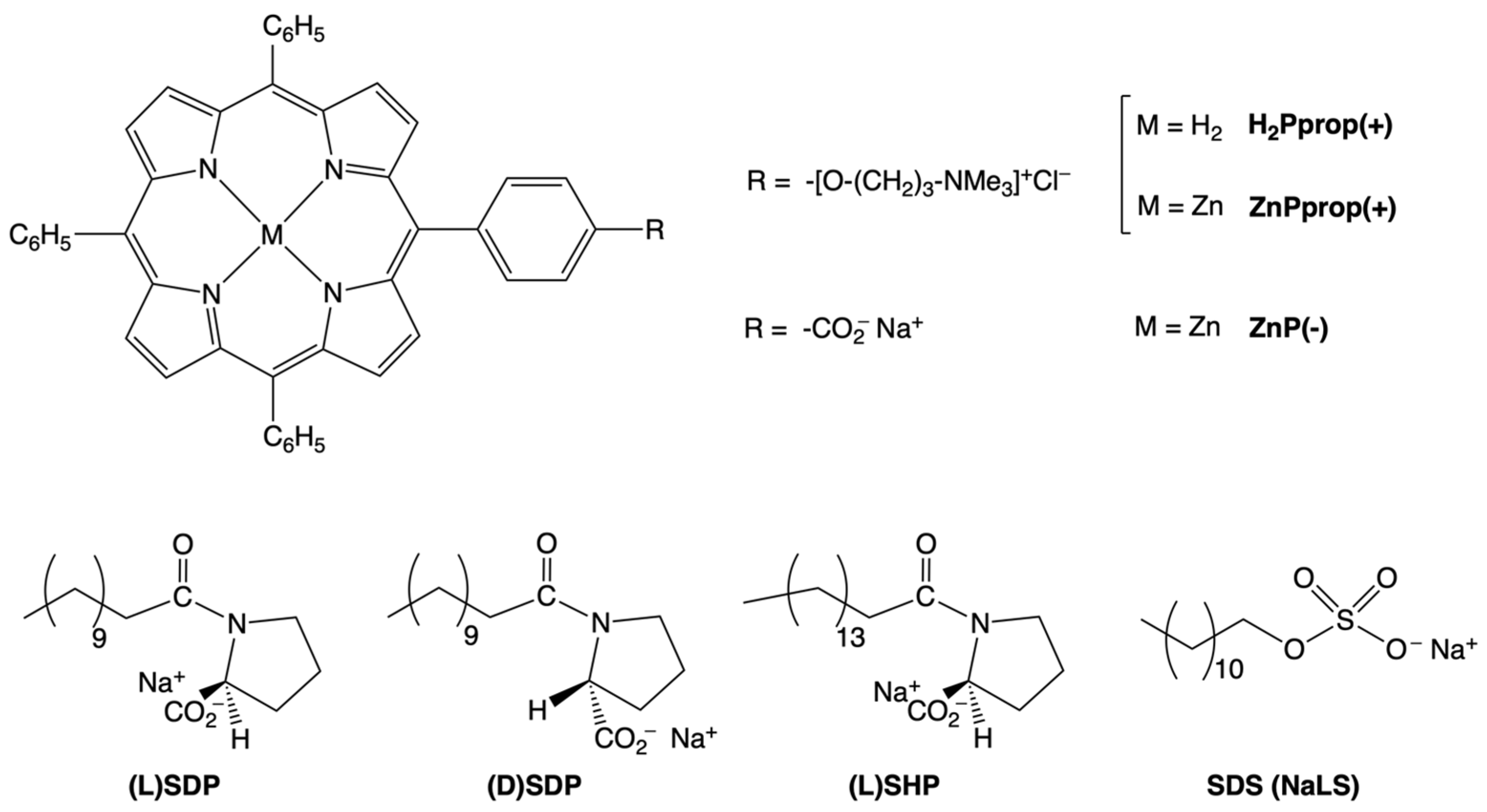 - Simoncini, E.; Caroleo, F.; Ceccacci, F.; Mancini, G.; Stefanelli, M.; Paolesse, R.; Lettieri, R.; Venanzi, M.; Monti, D. Surfactant-induced chirality on reluctant aggregates of a chiral amphiphilic cationic (L)-proline–Zn(II)porphyrin conjugate in water. RSC Adv. 2014, 4, 55362–55366. [Google Scholar] [CrossRef]