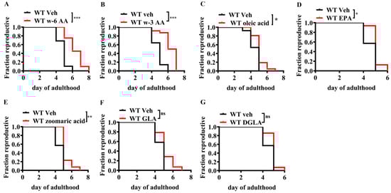 Effect of unsaturated fatty acids on the reproductive lifespan of Caenorhabditis elegans (n = 21–30). (A) ω-6 Arachidonic acid (ω-6 AA, 20:4, 10 µM) and (B) ω-3 arachidonic acid (ω-3 AA, 20:4, 10 µM) significantly extended the reproductive lifespan in C. elegans. (C) Oleic acid (18:1, 10 µM), (D) EPA (20:5, 20 µM), and (E) zoomaric acid (16:1, 10 µM) slightly extended the reproductive lifespan of C. elegans. (F) GLA (18:3, 10 µM) and (G) DGLA (20:3, 10 µM) had no significant effect on the reproductive lifespan. * p < 0.05, ** p < 0.01, *** p < 0.001; ns, no significant difference.