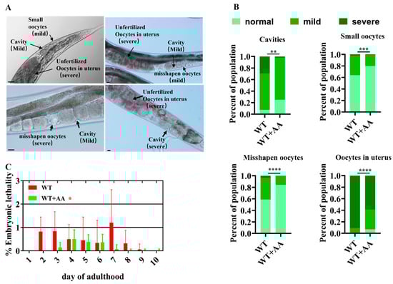Reproductive aging is mainly attributed to a deterioration in oocyte quality []. Therefore, we investigated the direct effect of AA on oocyte quality. AA supplementation significantly reduced the frequency of abnormal oocytes in reproductively senescent WT worms (Figure 2A,B) and improved embryo hatching rates (Figure 2C).