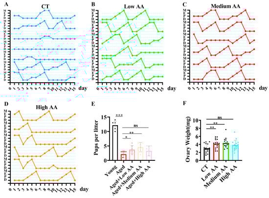 Arachidonic acid (AA) supplementation improves fertility in reproductive aging mice. (A–D) Estrous cycle patterns of 14-month-old mice in control and different AA-supplementation groups (n = 6), showing proestrus (P), estrus (E), metestrus (M), and diestrus (D). (E) Statistical analysis of litter size, with young mice at 3 months and aged mice at 14 months of age (n = 7). (F) Ovarian weights in 14-month-old mice (n = 15). * p < 0.05, ** p < 0.01, *** p < 0.001; ns, no significant difference.