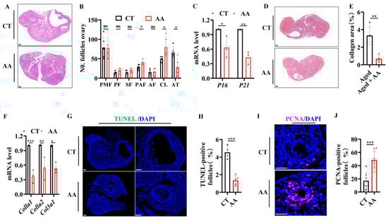 To evaluate the effects of AA on the ovarian reserve and aging, we performed the following experiments. Considering the beneficial effect of 75 mg/kg AA, subsequent experiments were performed using this concentration. An evaluation of the effects of AA on the ovarian reserve was performed by staining ovarian tissue sections with hematoxylin and eosin (H&E). This showed an increase in preantral follicles and corpora lutea and a decrease in atretic follicles compared to numbers in age-matched controls (Figure 4A,B). The expression of the cell cycle-inhibitory proteins p16 and p21, which are markers of aging [,], was detected in the ovaries using real-time (RT)-PCR. mRNA expression in the AA-supplemented group was lower than that in the control group (Figure 4C). Fibrosis is a hallmark of ovarian aging and can affect oocyte release in the ovarian stromal region []. Masson’s trichrome staining of ovarian sections in mice showed a significant decrease in staining intensity in the AA group compared with that in the control group (Figure 4D,E). RT-PCR analysis of the fibrosis-related genes Col1a1, Col1a2, and Col3a1 revealed significantly lower expression in the AA group than in the control group (Figure 4F). To study the cellular changes in ovarian granulosa cells, we used PCNA and TUNEL staining to detect granulosa cell proliferation and apoptosis during follicle development []. The results showed a significantly lower apoptosis rate (Figure 4G,H) and an increased proliferation rate (Figure 4I,J) in granulosa cells from the AA group compared to those in the control group. These results suggest that AA supplementation delayed age-related decreases in the ovarian reserve and senescence in mice.