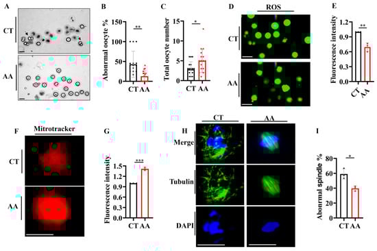 Significant improvements were observed during the study of the effects of AA on the quantity and quality of oocytes in aged mice. AA-supplemented mice showed a reduced rate of abnormal oocytes (Figure 5A,B) and the total number of ovulation events in 14-month-old mice (Figure 5C) compared to the control group. This shows that AA supplementation may play a positive role in preserving or improving the quality of oocytes.