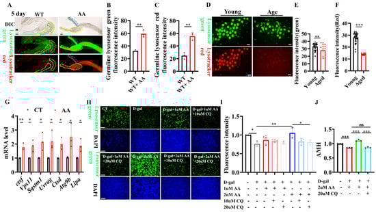 Reportedly, AA activates lysosomal activity [], and lysosomal activity plays an important role in reproductive aging []. We aimed to determine whether AA retards reproductive aging via lysosomes. AA supplementation rescued the age-induced reduction in lysosomal activity in the nematode germline, as demonstrated through LysoTracker and lysosome sensor staining assays (Figure 6A–C). We simultaneously assayed the lysosomal activity of oocytes from young and old mice and found that in old mice, it was significantly lower than that in young mice (Figure 6D–F). Lysosome-related gene activities in mouse ovaries were then examined via quantitative real-time PCR (qPCR). Here, the mRNA expression of lysosomal activity-related genes was elevated in AA-supplemented aged mice compared to that in controls of the same age (Figure 6G).