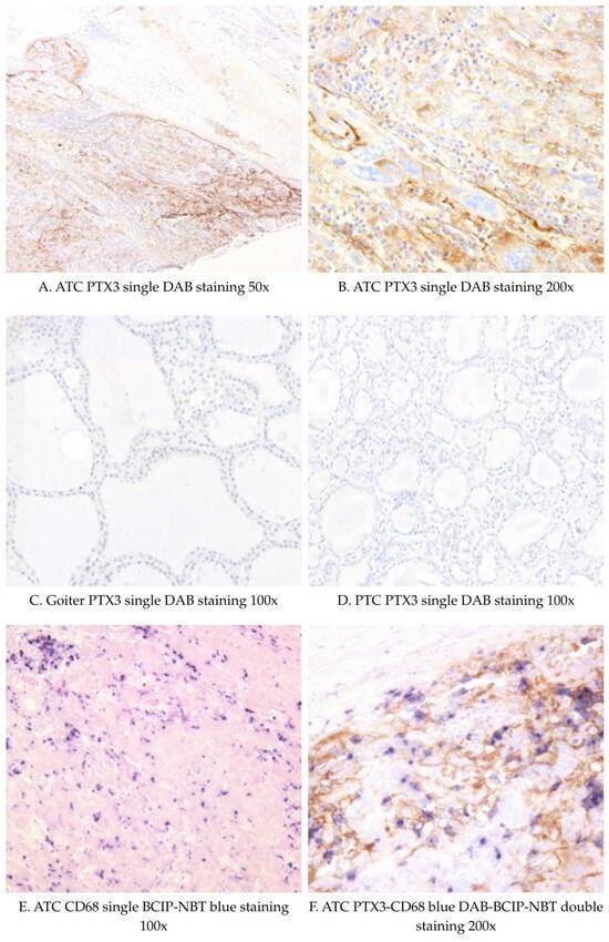 Given the retrospective design of the study and the rarity of ATC and PDTC, the number of available tissue samples for these subtypes was limited. The analysis of PTX3 and CD68 staining in ATC and PDTC was therefore descriptive, as the small sample size precluded meaningful statistical comparisons.