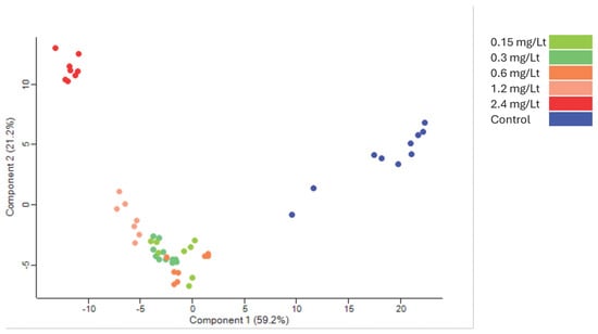 The tryptic peptides were analyzed with nanoLC-MS/MS operating in DIA mode, generating a robust and sensitive dataset. The raw files were processed and the proteome identified was cross-run normalized within the DIA-NN software. The generated dataset consisted of a total of almost 10,500 protein groups and 8300 proteins identified using only proteotypic peptides. This high-quality dataset nearly encompasses the total canonical proteome of zebrafish embryos (see Section 3, Supplementary Data S1). Principal component analysis (PCA) presented a distinct separation between extract dosing (Figure 2).