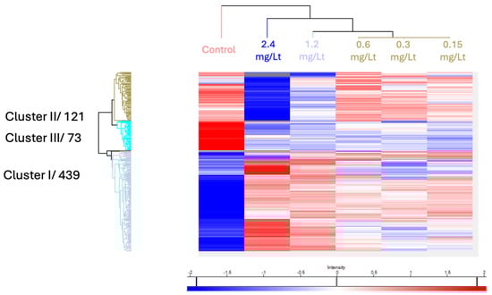 Global comparison between the various doses visualized by a heat map, displayed major dose-dependent changes that were clustered into three main groups (see Figure 3). The effect on the proteome level was more prominent at the two highest concentrations.