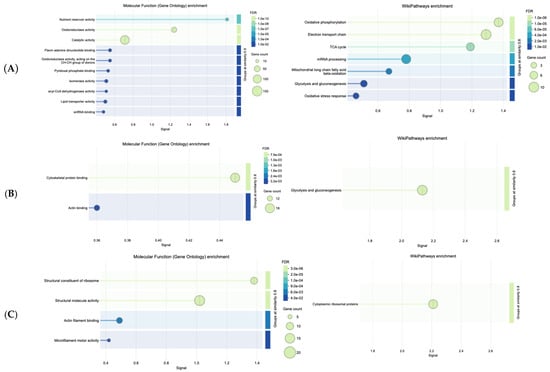 The STRING databases mediated enrichment analysis (false discovery rate (FDR) values are presented in the Wikipathways diagrams, Figure 4A, Figure 4B (FDR = 5.35 × 10−9) and Figure 4C (FDR = 5.59 × 10−9), respectively, and signal in x-axis represents the enrichment score) of the three main clusters, revealing Wikipathways primarily related to OxPhos, ETC, and TCA, and to a lesser extent to mitochondrial long-chain fatty acid beta-oxidation (MLCFA beta-oxidation) and mRNA processing (to mature RNA).