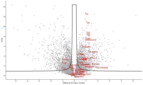 Mass spectrometry-based quantitative proteomics was performed to understand the changes induced by the administration of the CMG extract to the zebrafish embryos. We used the whole protein extracts of the embryos and sought to focus on the liver-related protein changes, as already observed microscopically (see Figure 1 below). Liver was selected due to its key roles in glycogen and lipid storage (interrelated with antioxidant activity), the metabolism of xenobiotics, and the zebrafish liver’s ability to regenerate and respond to stressors, as evidenced by liver histopathology [,]. The zebrafish cultures were fed with non-toxic CMG concentrations ranging from 0.15 to 2.4 mg/L for 96 h. The zebrafishes were pooled, homogenized, and processed with the protease trypsin.