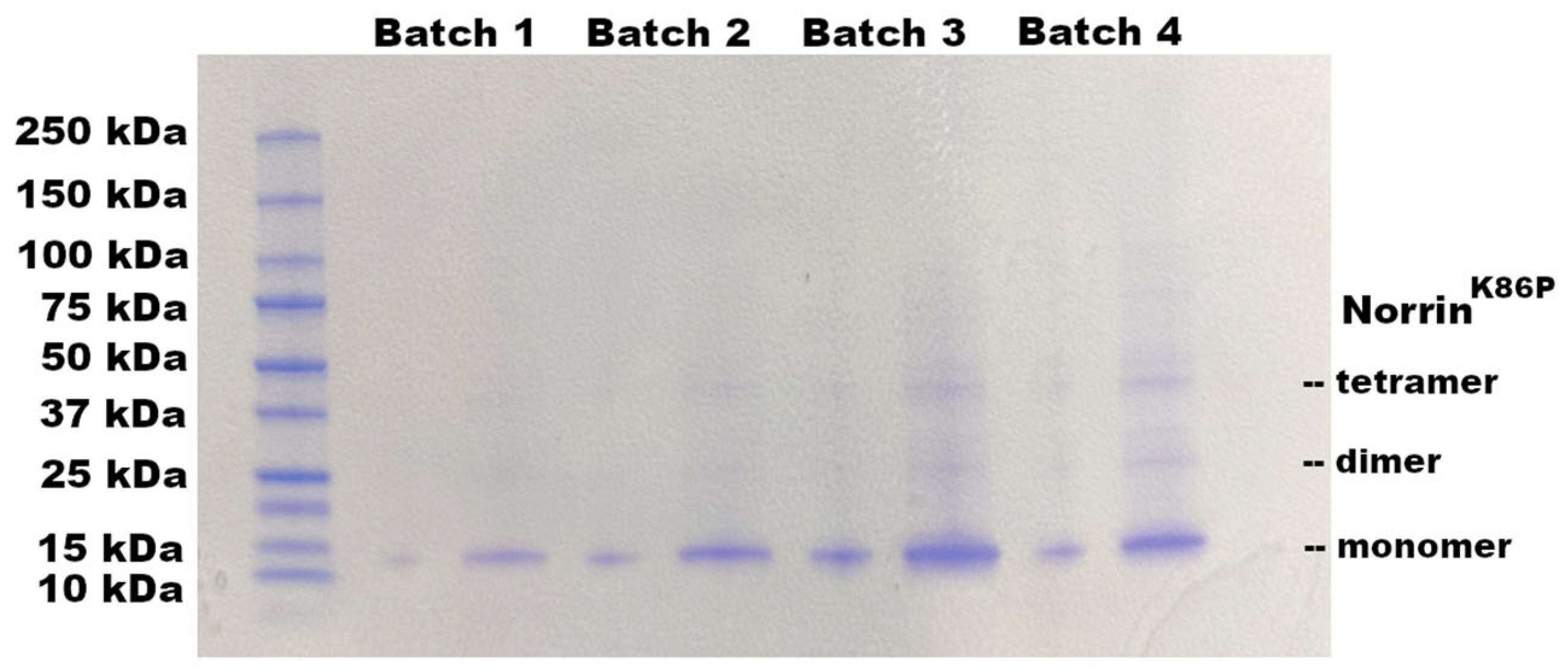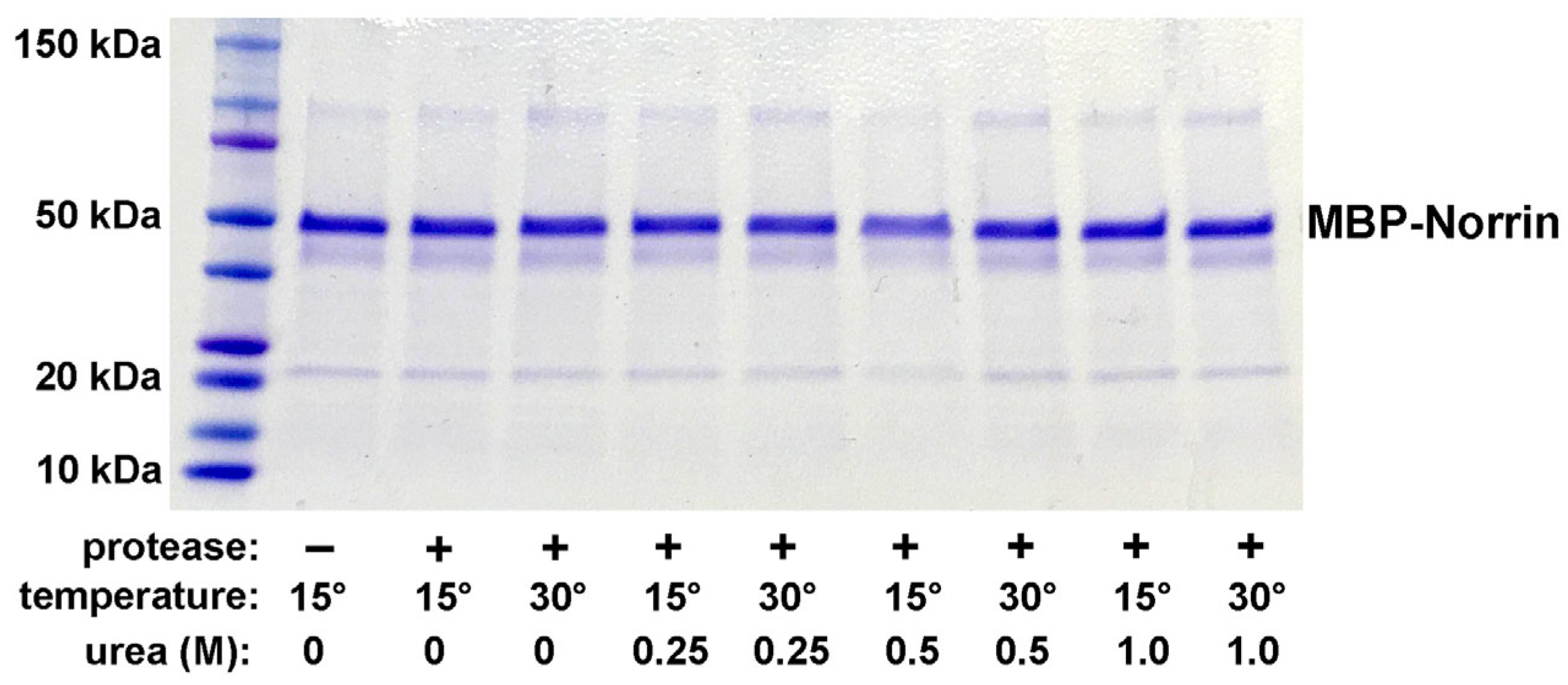 Initial development of bacterial recombinant Norrin protein expression first utilized MBP (Maltose-Binding Protein) fused to the N-terminal of the mature human Norrin amino acid sequence. This was explored because it is known that MBP–Norrin can be produced in