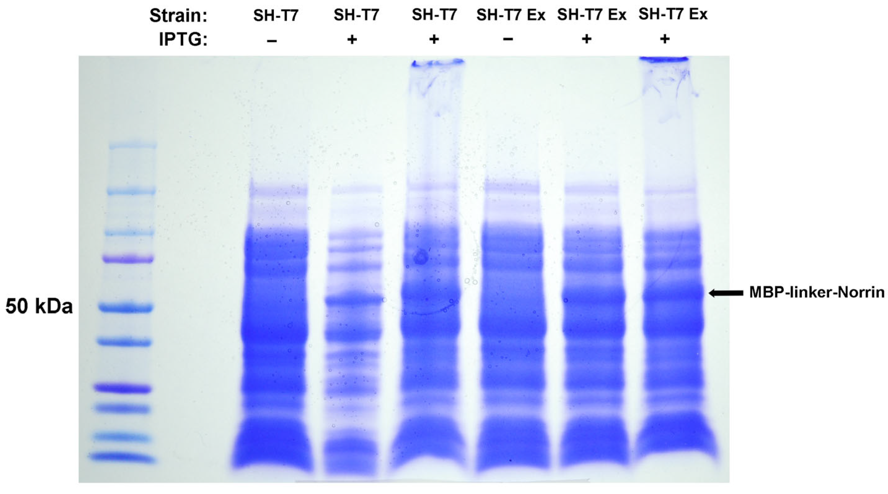 E. coli. The plasmid construct Nor-2 was a direct fusion of MBP with human Norrin. The plasmid construct Nor-w-Linker was similar but added extra polypeptide linker sections, positioned on either side of the HRV3C protease cleavage site (
