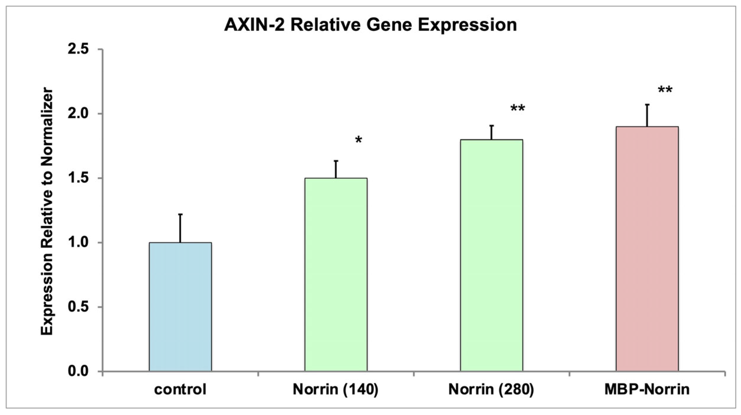 The refolding process of inclusion body protein was successful for generating recombinant NorrinK86P that was biologically active. Norrin biological activity was evaluated in two ways. First, using in vitro assays of Frizzled-4 binding, refolded NorrinK86P preparations displayed Frizzled-4-binding activity, compared to a control Norrin preparation. Second, refolded protein increased expression of the AXIN-2 gene in primary HRMECs, a known effect of Norrin.