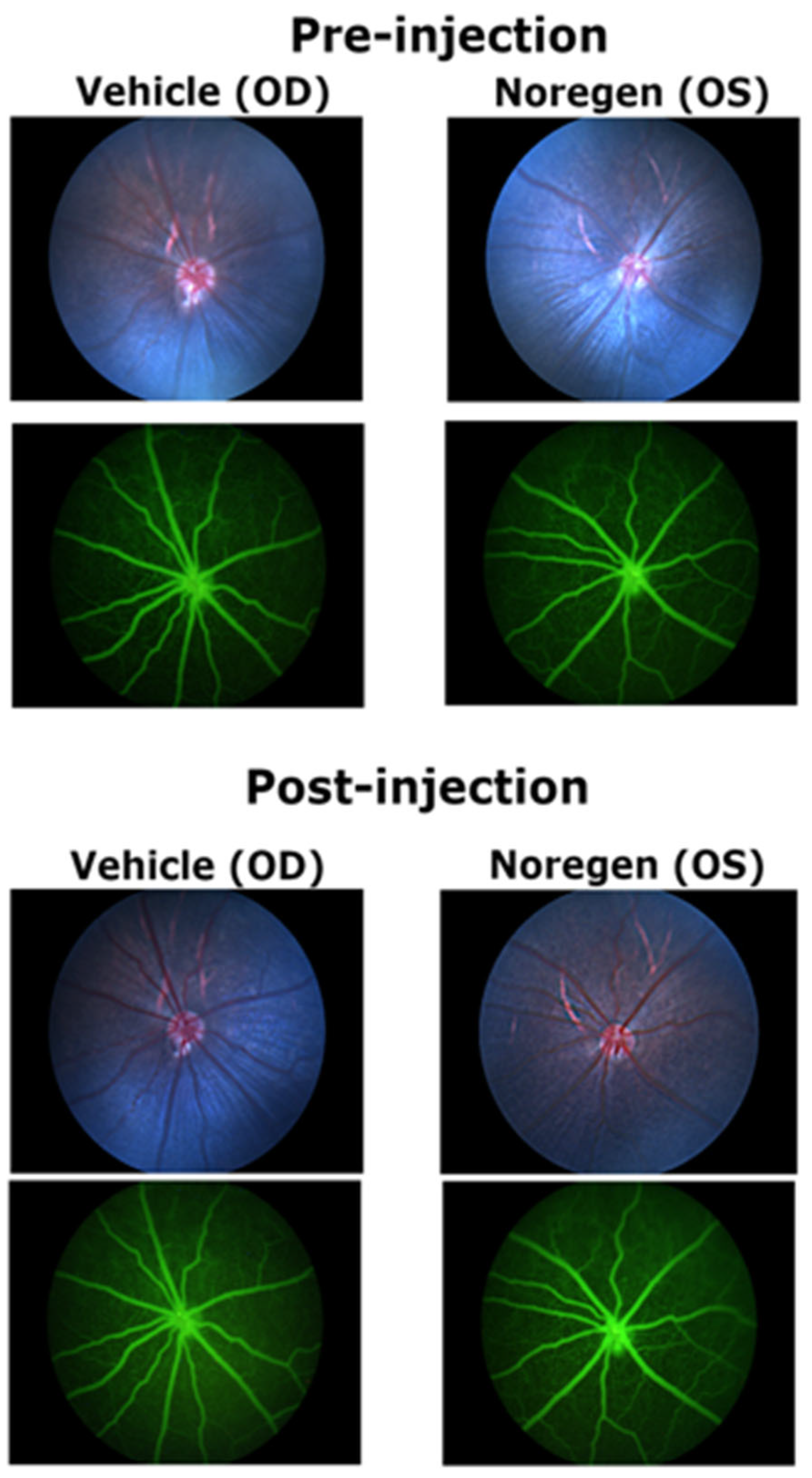 Pupils were dilated with tropicamide and phenylephrine drops prior to anesthesia. Rats were anesthetized with an intraperitoneal injection of a Ketamine HCL (50 mg/kg) and Xylazine (7 mg/kg). Rat retinas were imaged before and 3 weeks after injections of 250 ng NorrinK86P, using fluorescein angiography and SD-OCT imaging to record the status of their normal retinal vasculature. Recombinant NorrinK86P was diluted with phosphate-buffered saline solution (1× PBS, no calcium, no magnesium) to a concentration of 100 ng/µL for intravitreal injections of a 2.5 μL volume (dose 250 ng/eye). Injections were given with a NanoFil syringe with 35-gauge beveled NanoFil needles (WPI Inc., Sarasota, FL, USA). The contralateral eye served as a control and received the same injection procedure using vehicle alone (1× PBS).
