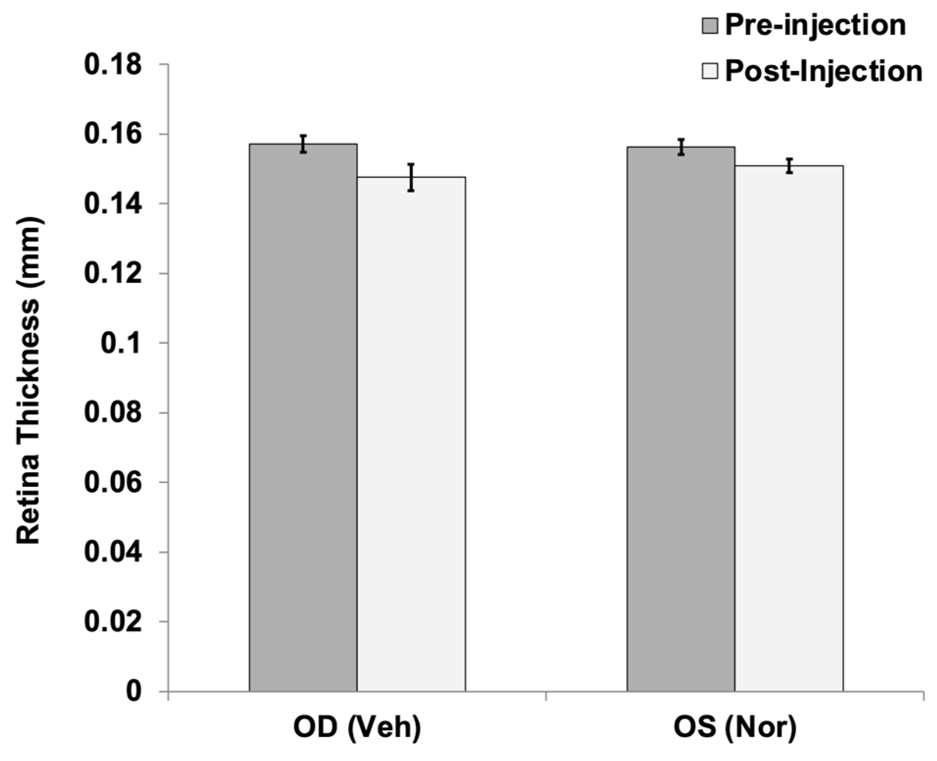27]. A fixed 5 × 5 grid was first centered on the optic disk. Boundaries of all retinal layers were marked at measurement grid locations. The central grid position was not used, as it marks the optic disk center. The remaining 24 grid positions were then used to generate an average thickness between the inner limiting membrane (ILM) and the outer limiting membrane (OLM) for each eye, both pre and post injection. Retinal thickness was measured between the ILM and the OLM.