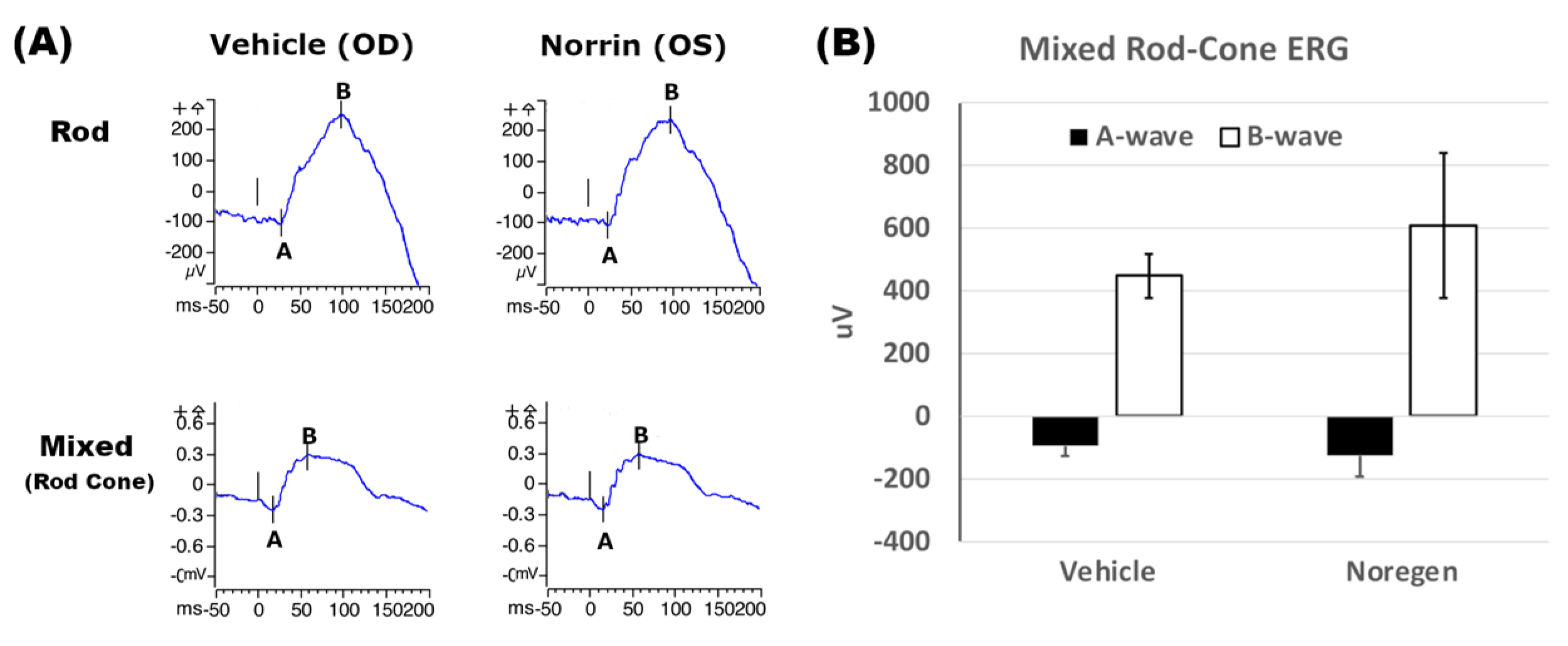ERG analysis was used to compare the Rod and mixed Rod–Cone responses of Long Evans rat retinas before and 6 weeks after intraocular injection of 250 ng NorrinK86P in vivo. A Diagnosys LLC Espion-III ERG system with ColorDome was used to obtain the full-field ERG responses in response to white light flash stimulation. Rats were dark-adapted for 2 h and then handled under red light room lighting in a rodent ERG imaging suite. Pupils were dilated with two applications of tropicamide and phenylephrine–HCl eye drops to ensure maximum pupil size prior to anesthesia. Once anesthetized, rats were positioned on a custom support platform with an integrated warming pad to maintain normal body temperature. Gold loop electrodes were used for electrical coupling to corneas bathed in a small application of corneal protectant (GenTeal lubricant gel). One platinum microneedle was inserted into the hind flank skin (ground electrode), and a second platinum microneedle (reference electrode) was inserted into the skull cap skin just forward of the ears to minimize the detection of cardiac activity (EKG) in the ERG trace. A custom program was used to reproducibly automate the ERG testing. For the Rod-only response, dark-adapted rats were first stimulated with white light (6500K) flashes using a dimmer illumination intensity of 0.01 cd-s/m2. Immediately after the Rod test sequence, the mixed Rod–Cone ERG sequence was recorded using a brighter flash intensity of 3 cd-s/m2 to activate both Rod and Cone photoreceptors. Five traces were time-averaged to generate all ERG traces.