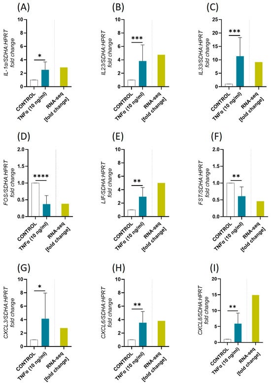 Real-Time PCR validation of the selected differentially expressed genes (DEGs; the established criteria: padjusted < 0.05; log2 fold change (log2FC) ≥ 1.0/log2FC ≤ −1.0; (A) IL-1α,(B) IL-23, (C) IL-33, (D) FOS, (E) LIF, (F) FST, (G) CXCL3, (H) CXCL6, (I) CXCL8 identified by RNA-seq in equine endometrial fibroblasts (n = 5) after 96 h of TNFα treatment (10 ng/mL). Data were expressed as mean ± SD and as a fold change to the control group within each endometrium category. Statistical analysis was performed using Student’s t-test or nonparametric Mann–Whitney U test. Asterisks denote statistical differences (* p < 0.05, ** p < 0.01, *** p < 0.001, **** p < 0.0001) in comparison to the respective control group. IL-1α: interleukin 1α; IL-23: interleukin 23; IL-33: interleukin 33; FOS: Fos Proto-Oncogene, AP-1 Transcription Factor Subunit; LIF: leukemia inhibitory factor; FST: follistatin; CXCL3: C-X-C Motif Chemokine Ligand 3; CXCL6: C-X-C Motif Chemokine Ligand 6; CXCL8: C-X-C Motif Chemokine Ligand 8.