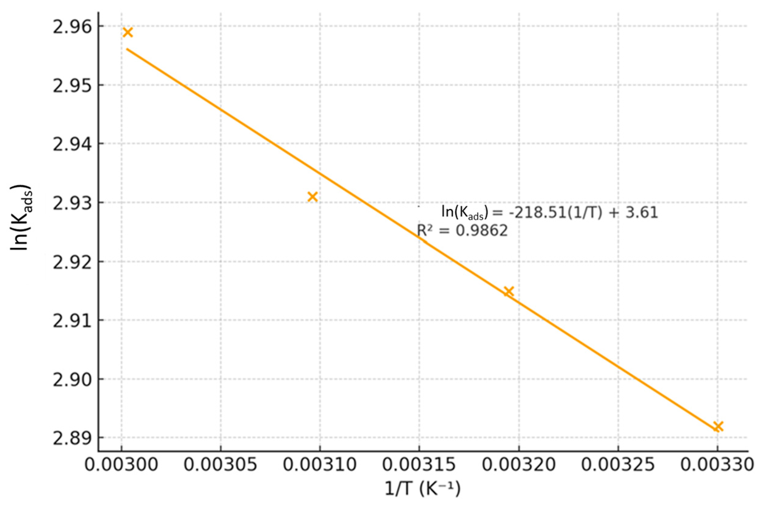 | Temperature (K) | Kads (L/g) | ΔG°ads (kJ/mol) | ΔH°ads (kJ/mol) | ΔS°ads (J/mol·K) |