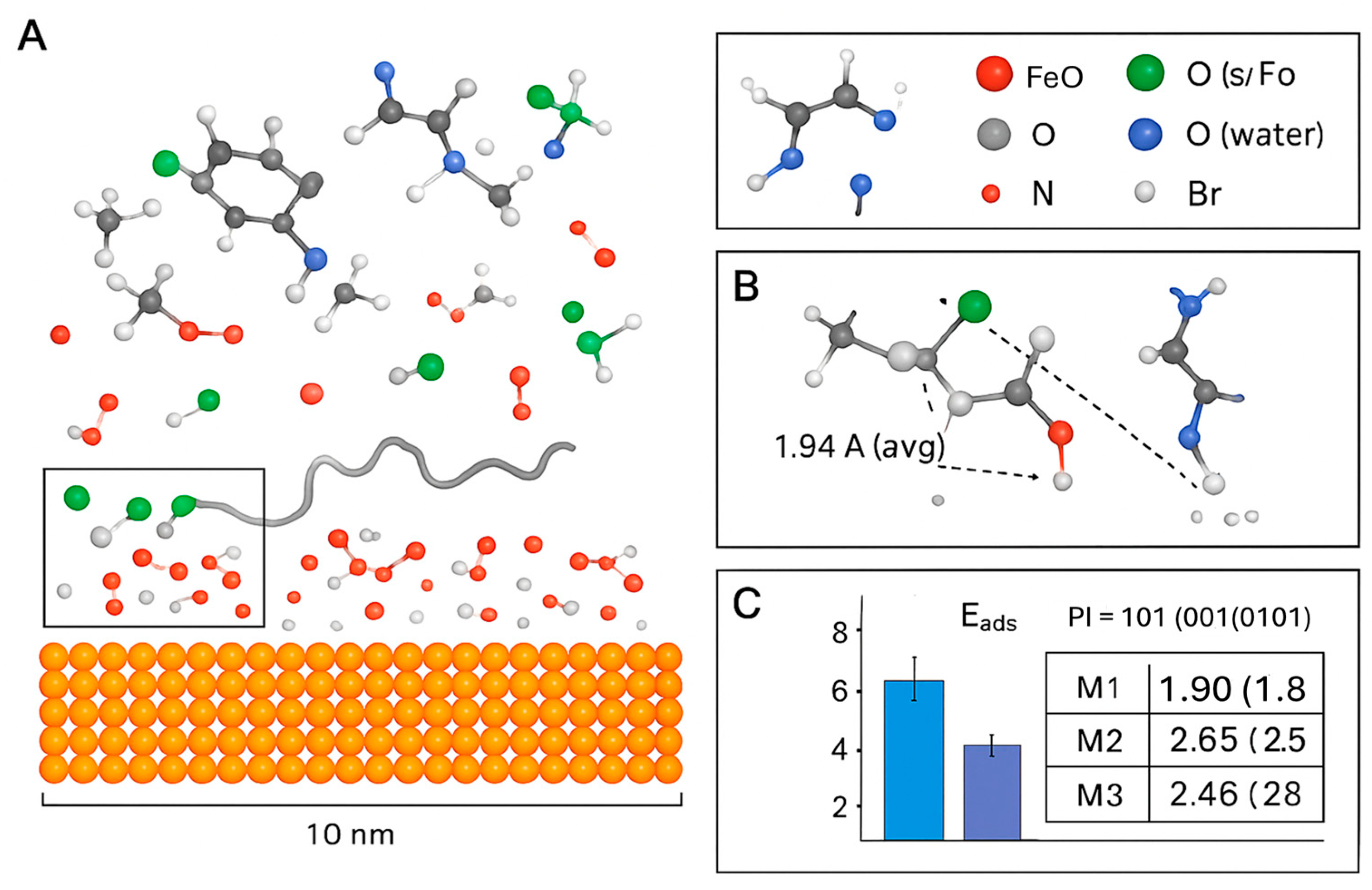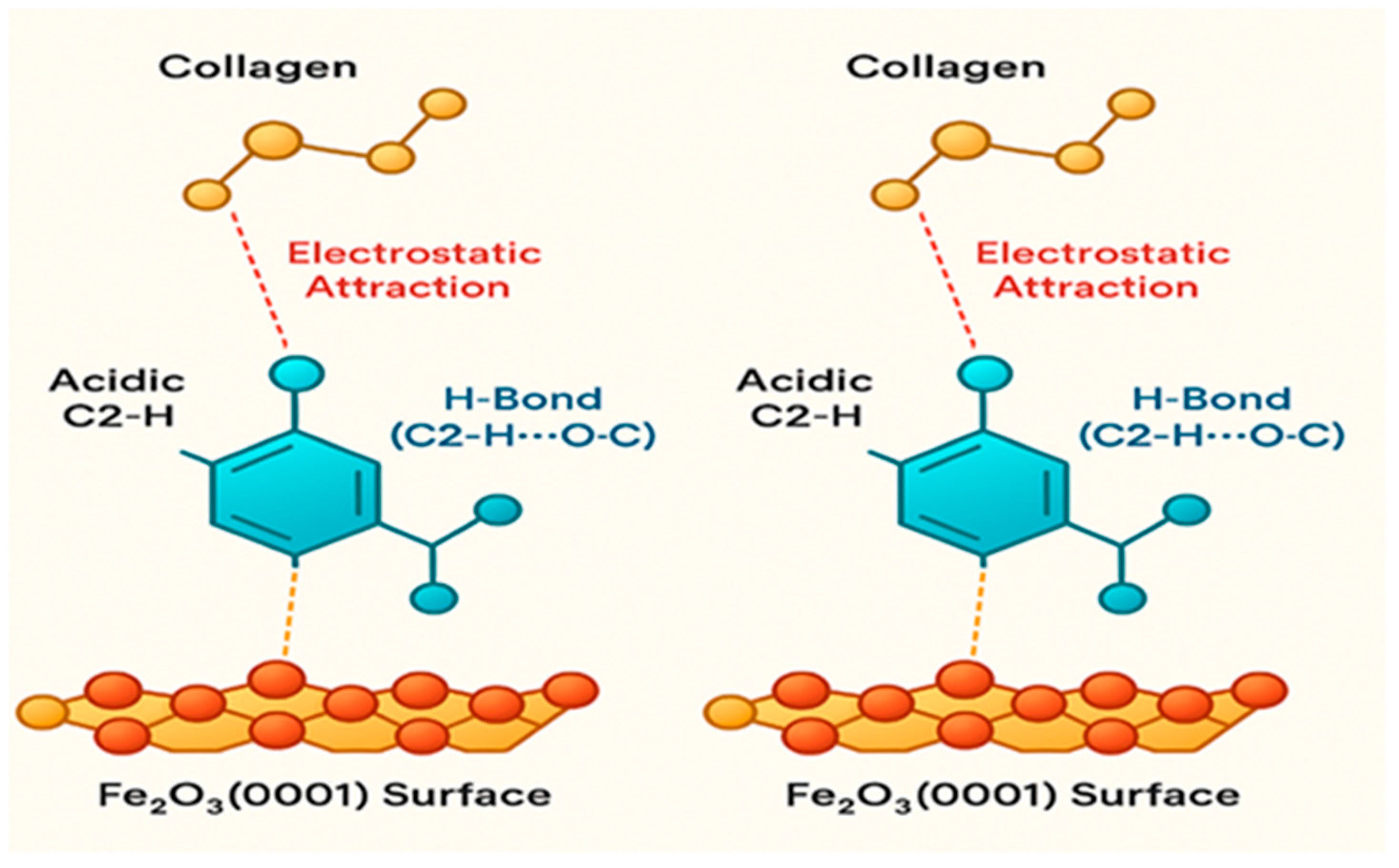 - Synergy in the Ionic Bridge (M3) is confirmed: The most significant finding is the dramatically increased adsorption energy for the M3 configuration (−2.65 eV). This value is more negative than the sum of M1 and M2, providing clear evidence of a synergistic effect where the BMIM+ cation acts as a bridge, enhancing the binding of collagen to the surface [46]. The computed charge transfer from the inhibitor molecules to the metal surface also increases in this bridged configuration, indicating a more effective barrier to charge transfer during corrosion [38].