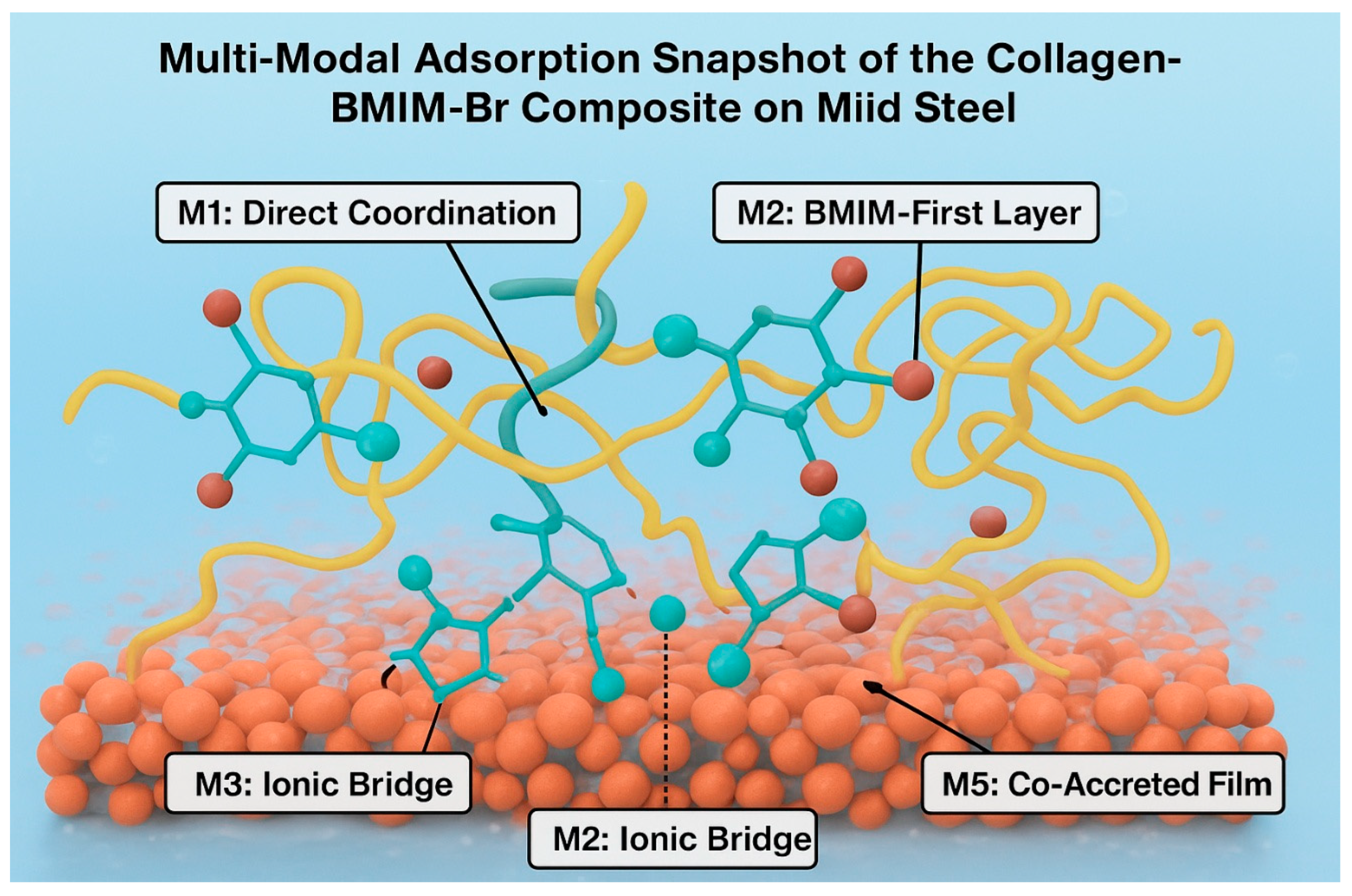 - Co-Accreted Polymeric Film (M5): The simulation captures the spontaneous formation of a cross-linked network, where BMIM+ cations dynamically bridge between anionic sites on different collagen chains. This validates the “Co-Accreted Polymeric Film” mechanism (M5), leading to the formation of a thick, cohesive layer that significantly hinders the diffusion of corrosive species [22].
