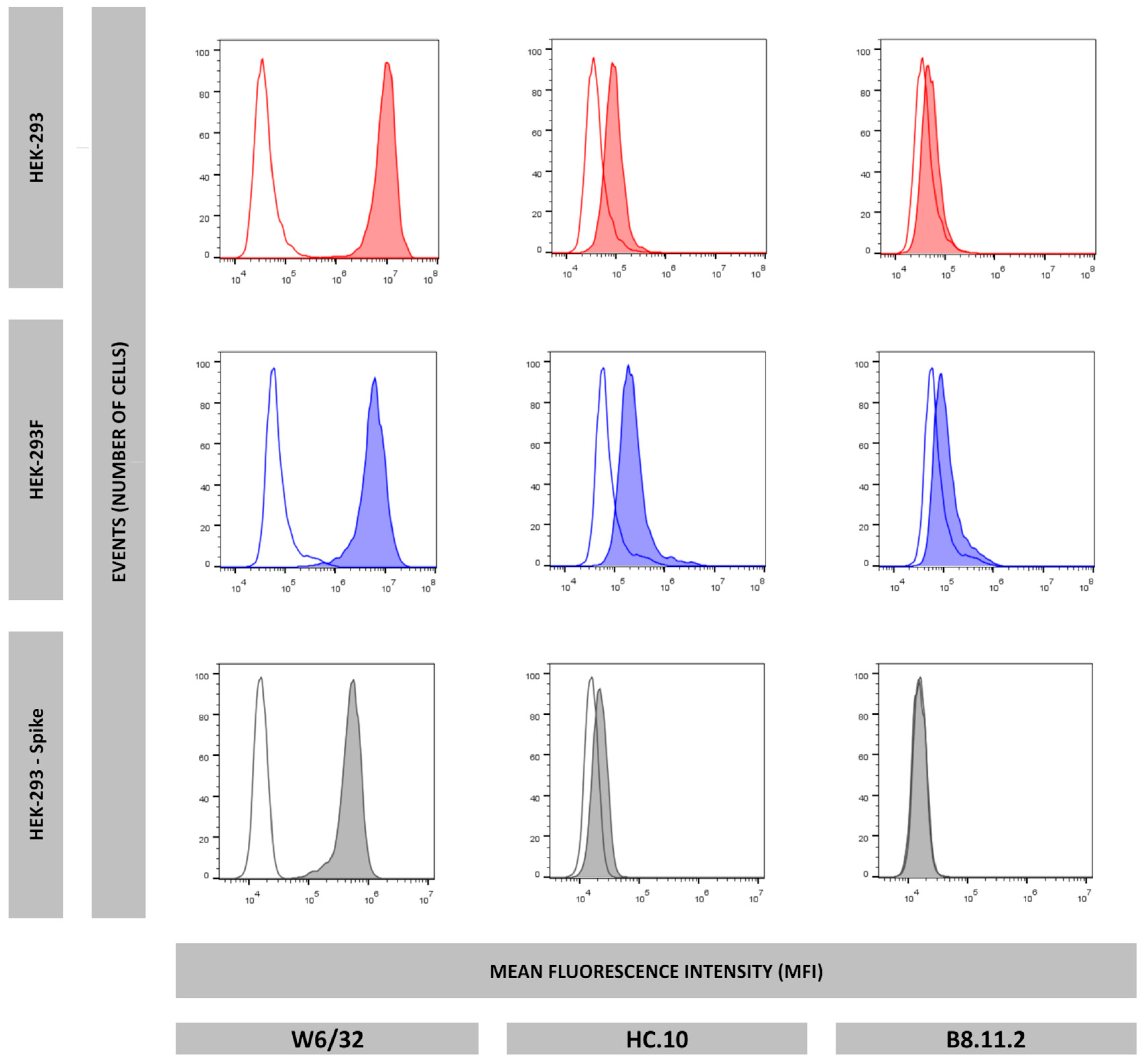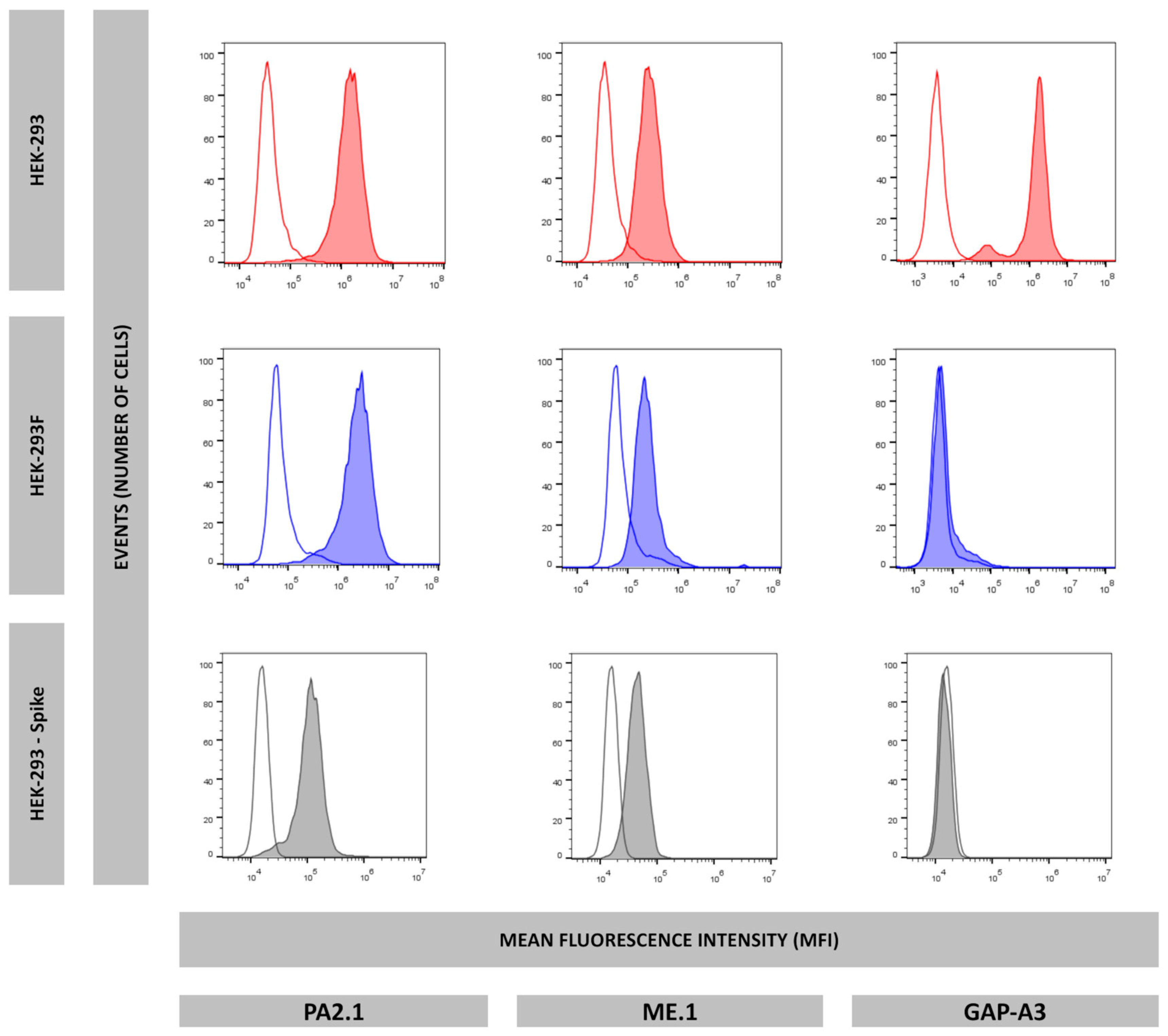 5 HEK-293, HEK-293F, or HEK-293-Spike transfectant cells were washed twice in 200 μL of PBS 2%FBS and resuspended in 50 μL of undiluted mAb supernatant (anti-HLA-A3 was diluted 1:200 in PBS 2%FBS). After incubating for 30 min, cells were washed three times in 200 μL of PBS 2%FBS and resuspended in 50 μL of fluorescein isothiocyanate-conjugated anti-mouse IgG rabbit antiserum (Calbiochem-Novabiochem GmbH, Schwalbach, Germany) diluted 1:200, incubated for 30 min, and washed three times in 200 μL of PBS. All operations were performed at 4 °C. Flow cytometry was conducted using a CytoFlex Cytometer (Beckman Coulter Life Sciences, Indianapolis, IN, USA).