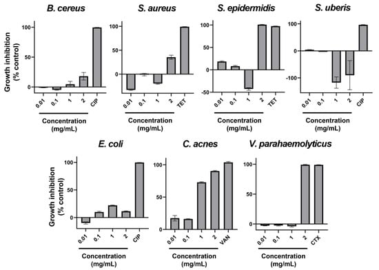 Percentage of growth inhibition with AAG ethanol extract increasing concentrations (0.01, 0.1, 1, and 2 mg/mL), as well as a positive control of inhibition (antibiotic) for Bacillus cereus, Staphylococcus aureus, Staphylococcus epidermidis, Streptococcus uberis, Escherichia coli, Cutibacterium acnes, and Vibrio parahaemolyticus. Error bars in each datapoint are the calculated SEM (n = 3). CIP—Ciprofloxacin; TET—Tetracycline; VAN—Vancomycin; CTX—Cefotaxime.