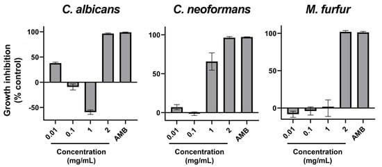 Percentage of growth inhibition with AAG ethanol extract increasing concentrations (0.01, 0.1, 1, and 2 mg/mL), as well as a positive control of inhibition (antimycotic) for Candida albicans, Cryptococcus neoformans, and Malassezia furfur. Error bars in each datapoint are the calculated SEM (n = 3). AMB—Amphotericin B.