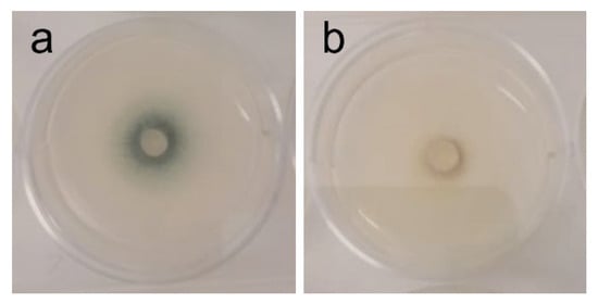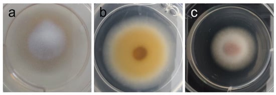 Among yeast-like fungi, C. neoformans and M. furfur presented MIC at 2 mg/mL (Figure 2). Strengthening our results, Genovese et al. [] reported the activity of the ethanol extract of A. taxiformis against C. neoformans and C. gatii, with MIC found between 1.56 and 3.12 mg/mL, depending on the strain. In the case of M. furfur, research on the efficacy of red seaweed extracts is scarce, and alcoholic extracts from several red seaweeds have been reported to lack activity against this fungus []. Because these fungi are significant human and veterinary pathogens, and antimycotic resistance is an emerging concern [,], this result is an important precedent to encourage further research with AAG biomass in these fields. Among filamentous fungi, Fusarium graminearum was the most susceptible of those tested: its growth was inhibited by 40% (Table 3), and its orange pigmentation was severely inhibited as well (Table 4 and Figure 4). Being the causative agent of Fusarium head blight (FHB), it causes massive economic losses by impacting plant growth and rendering what’s left unusable due to contamination with mycotoxins (toxic for livestock and humans alike) produced by the fungus [,,,,,]. Toledo et al. have demonstrated that the ethanolic extract from AAG biomass was able to inhibit spore germination in F. oxysporum at 1 mg/mL, showcasing the potential of AAG ethanol extract for different agricultural applications against this genus of phytopathogens. Although growth inhibition as measured by GRSDF was only moderate, the inhibition of pigmentation (Table 4/Figure 4) is an important feature of the extract; in fact, the most likely pigments that give F. graminearum its light and dark orange colors (which disappear upon exposure to AAG ethanol extract) are aurofusarin and rubrofusarin, and both have been associated to F. graminearum production of mycotoxins (aurofusarin is also considered a neglected mycotoxin) []. That being the case, which requires further studies for validation, our results might imply that AAG is capable of modulating the phenotype of this species, potentially towards a less toxic or virulent one.