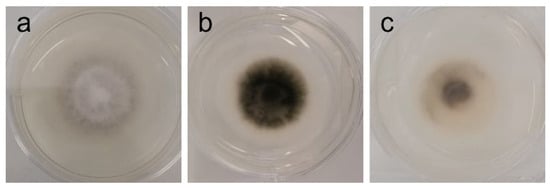 Phenotypic alterations in Stemphylium vesicarium in the presence of AAG ethanol extract at full radial growth [(a)—control top view; (b)—control bottom view; (c)—ethanol SLE bottom view].