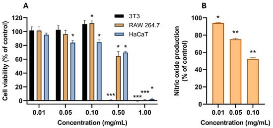 (A) Cell viability (in percentage of growth control) of AAG ethanol extract increasing concentrations (0.01, 0.05, 0.1, 0.5, and 1 mg/mL) in three mammalian cell lines (3T3, RAW264.7, and HaCaT). (B) In vitro NO production (in percentage of LPS-stimulated control in the absence of other agents) from LPS-stimulated RAW264.7 cells in the presence of non-cytotoxic concentrations of AAG ethanol extract. Asterisks indicate statistically significant differences, calculated using a one-sample t-test: *—p-value < 0.05; **—p-value < 0.01; ***—p-value < 0.001.
