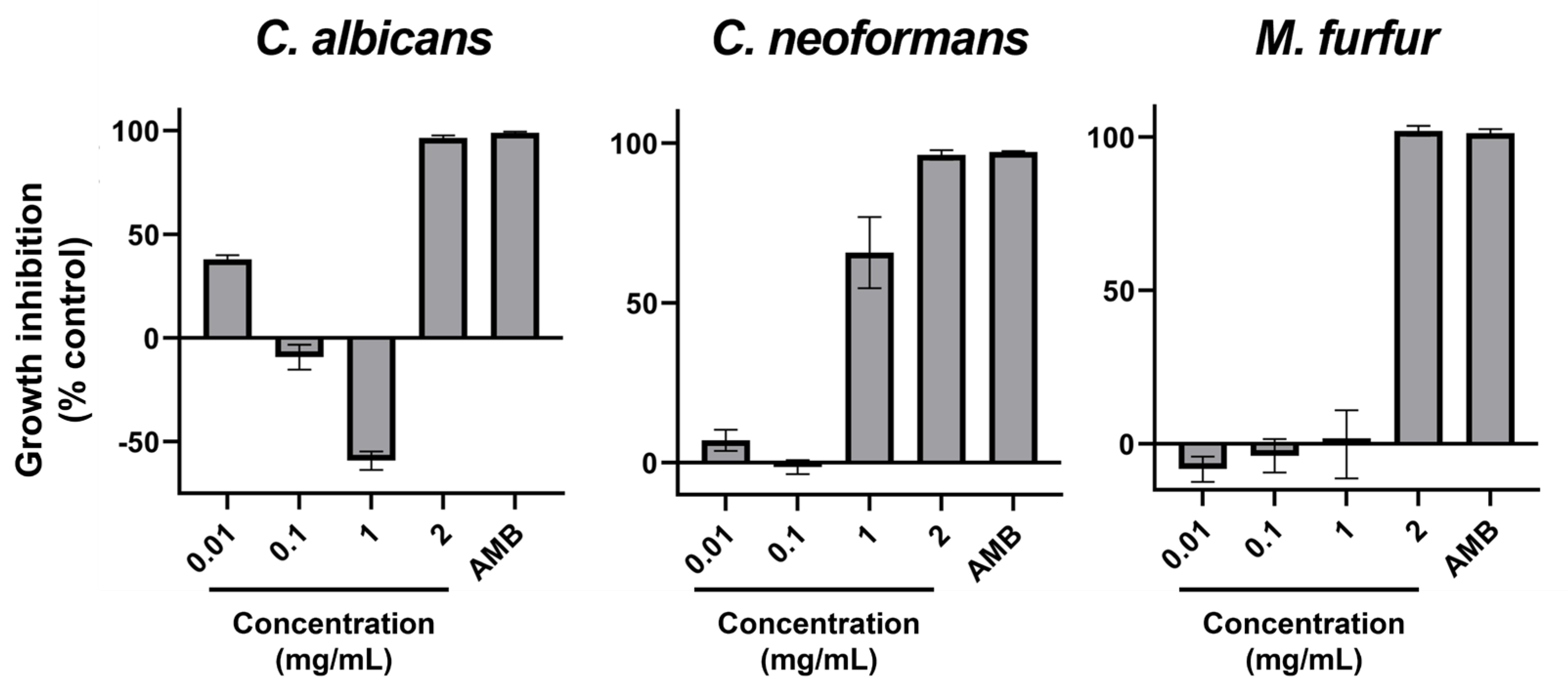 | Cryptococcus neoformans | PDA | 48 h; 25 °C | RPMI | 72 h; 35 °C | AMB 4 µg/mL |