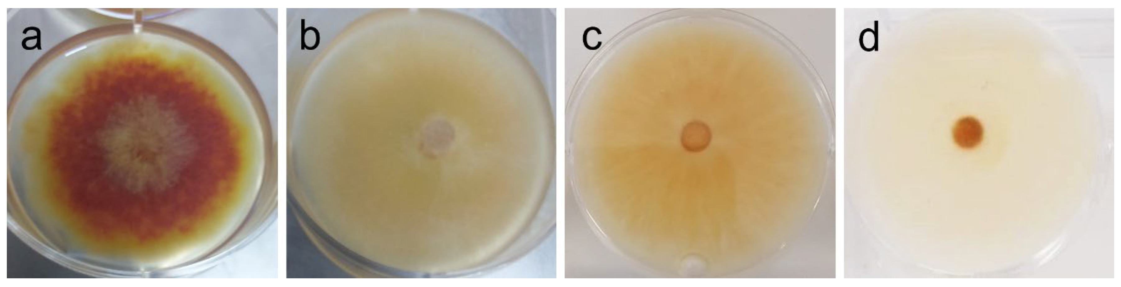 | F. graminearum | Dark orange mycelium, with yellow borders; yellow aerial hyphae at center (plug) [see Figure 4a] | Marked reduction of pigmentation, attributable to extract (1–2 mg/mL); also, weakened mycelium and absent aerial hyphae, but attributable to vehicle (DMSO). [see Figure 4b–d] |