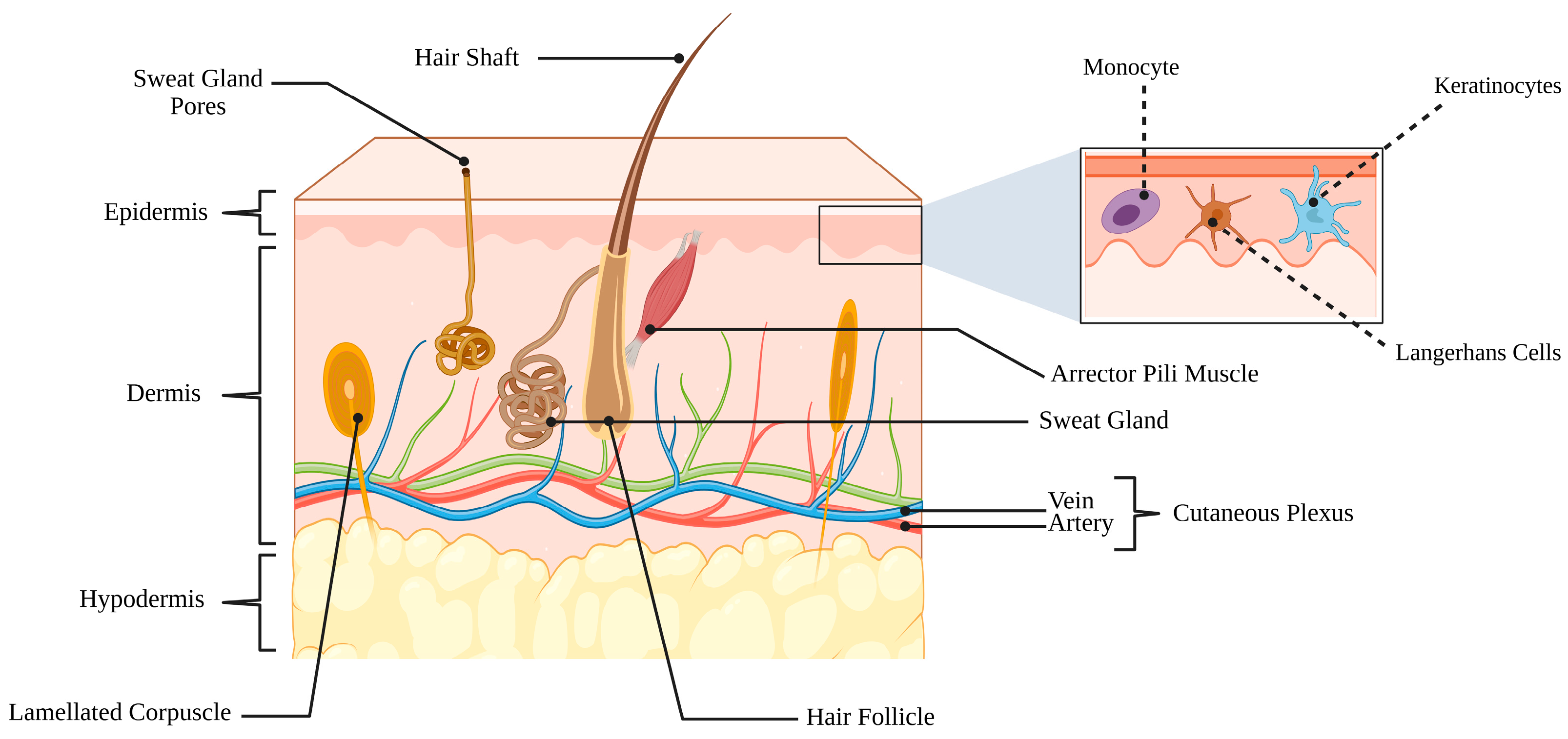 - Lotfollahi, Z. The anatomy, physiology and function of all skin layers and the impact of ageing on the skin. Wound Pract. Res. J. Aust. Wound Manag. Assoc. 2024, 32, 6–10. [Google Scholar] [CrossRef]