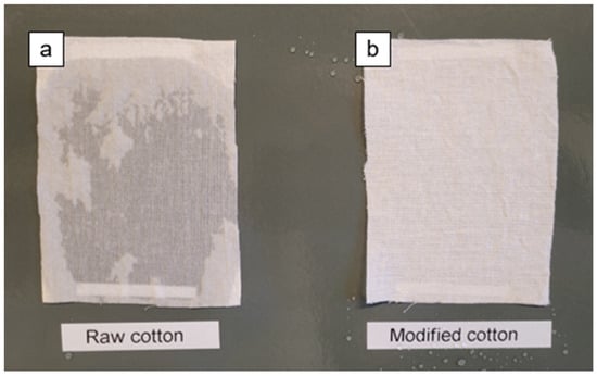 Photograph of raw cotton (a) and modified cotton fabric (CS2) (b) after pouring a stream of water.
